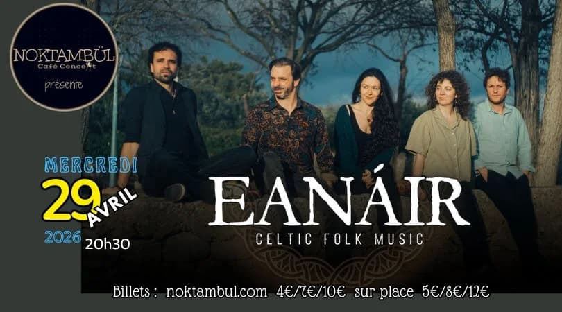 Le quintet EANÁIR propose un hommage vibrant et lumineux aux musiques traditionnelles celtiques. Leur musique fougueuse et sensible mêle Folks Songs et Tunes instrumentaux, chantée en irlandais, anglais, gallo, breton et français.