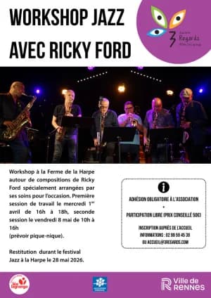 Workshop autour de compos de Ricky Ford arrangées pour l'occasion. Deux sessions de travail avec Ricky et une restitution lors du Festival Jazz à la Harpe sont prévues. Ouvert à tous les instruments.